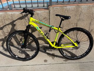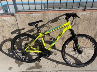 Bicicleta de montaña N-Star en color amarillo brillante. Ideal para disfrutar de rutas y caminos. - Cuadro de aluminio ligero. - Ruedas de 29 pulgadas. - Frenos de disco. - Suspensión delantera.