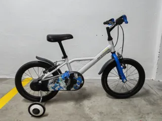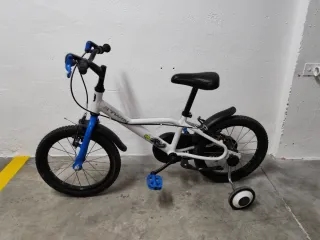 Bicicleta infantil B'TWIN de 16 pulgadas, ideal para los más pequeños. Cuenta con ruedines para facilitar el aprendizaje. - Cuadro de acero. - Frenos V-brake. - Sillín ajustable. - Diseño deportivo.