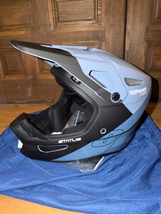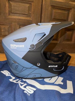 Casco integral 100% Status en talla XL. Diseñado para la máxima protección y comodidad. - Color: Azul y negro. - Diseño aerodinámico. - Visera ajustable. -Incluye funda protectora de tela.
