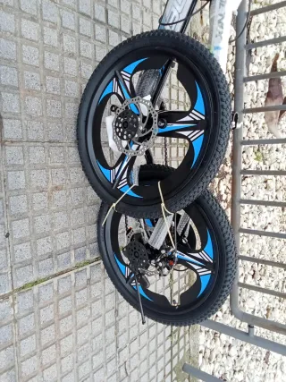 Bicicleta de montaña con un diseño moderno en colores negro y azul. - Cuadro con detalles gráficos. - Ruedas de 26 pulgadas con llantas de aleación. - Frenos de disco. - Manillar deportivo.