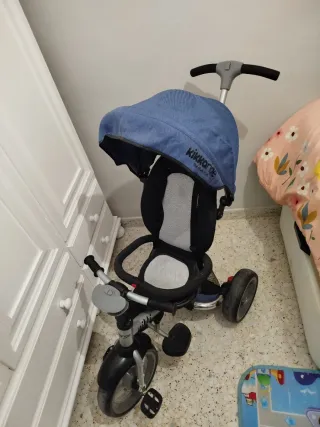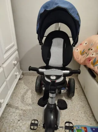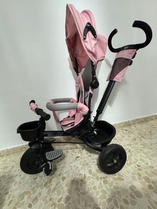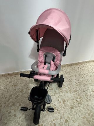 Triciclo infantil de color rosa, diseñado para acompañar el crecimiento del niño. De 1 a 5 años. Usado literalmente 2 horas. - Asiento acolchado y con arnés de seguridad. - Capota extensible para protección solar. - Reposapiés (quita y pon )y barra de empuje. - Cesta de almacenamiento. -Posibilidad de dejar triciclo autónomo sin empuje
