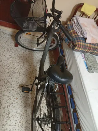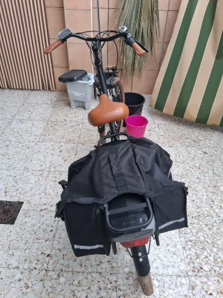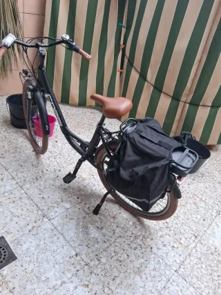 Bicicleta eléctrica en perfecto estado, con muy poco uso. - Color negro. - Sillín marrón. - Neumáticos marrones. - Bolsas traseras negras. - Pata de cabra.