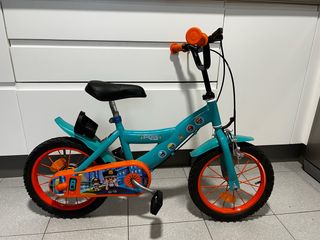 Bicicleta infantil de 12 pulgadas con diseño de Pin y Pon unisex. Ideal para los más pequeños. - Color azul turquesa. - Ruedines naranjas. - Cadena protegida con diseño. - Puños naranjas.