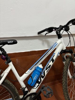 Bicicleta de montaña WST en color blanco con detalles azules. Incluye casco. - Cuadro de aluminio. - Suspensión delantera. - Frenos de disco. - Ruedas de 26 pulgadas. - Incluye casco. - Tiene patilla. - 7 marchas.