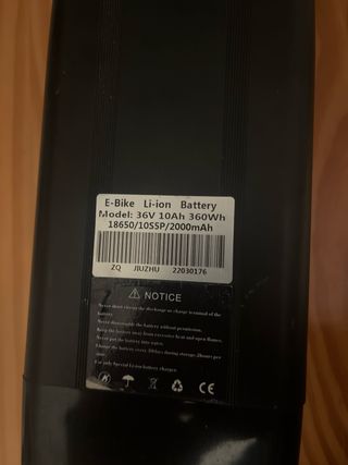 Batería de litio para bicicleta eléctrica. - Modelo: 36V 10Ah 360Wh. - Tipo de celdas: 18650/1055P/2000mAh. - Incluye cargador
