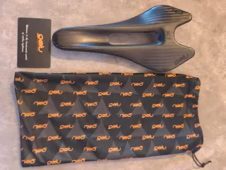 Asiento de bicicleta Gelu K.I. fabricado en carbono. - Diseño ligero y aerodinámico. Pesa 52 gr - De carbono. - Incluye bolsa de protección.
