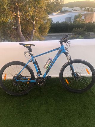 Bicicleta de montaña Cube en color azul, talla L. Ideal para disfrutar de rutas y senderos. - Cuadro de aluminio. - Suspensión delantera. - Frenos de disco. Tiene razgaños