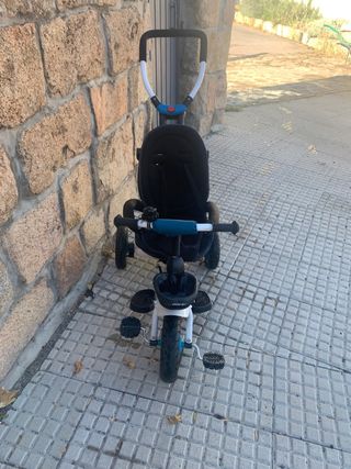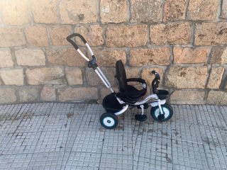Triciclo evolutivo para niños, ideal para acompañar su crecimiento. - Estructura blanca y negra. - Ruedas con detalles en azul. - Incluye cesta. - Empuñadura para padres.