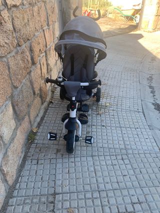 Triciclo gemelar evolutivo en color gris, perfecto para dos niños. - Diseño tandem para sentar a los niños uno detrás del otro. - Capotas para proteger del sol. - Reposapiés y barra de seguridad.