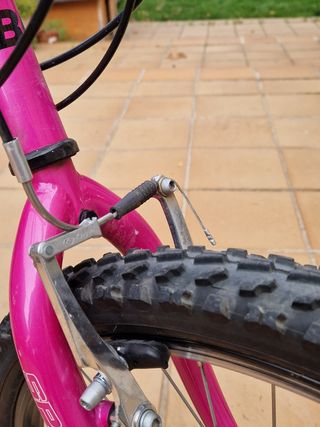 Bicicleta infantil de color rosa con detalles decorativos. - Cadena y pedales rosas. - Ruedines decorados con flores. - Diseño con dibujos de animales. Tiene la maneta de un freno con la punta rota como se ve en la imagen, por lo demás en perfectas condiciones solo a falta de hacer los ajustes habituales.