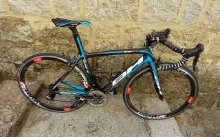 Bicicleta de carretera BH con cuadro de carbono y detalles en azul. - Cuadro de carbono. - Diseño deportivo en negro y azul. - Ruedas Vision.