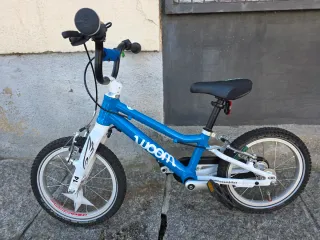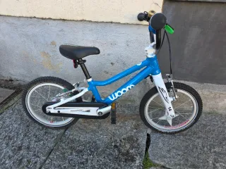 Bicicleta infantil Woom 2 de color azul. # MUY POCO USO #. Casi nueva. Muy bien cuidada, incluso el primer dia antes de usarla le montamos unos adhessivos gruesos protectores para no arañarla y estan sin arañazos los propios adhessivos. Las cubiertas son las de serie y se pueden ver aun los pelillos. Vendo porque se le ha quedado pequeña pero apenas la ha usado. Es una gran bici para los mas peques porque es súper ligera y la relación de marcha es blandita que les ayuda mucho a aprender. Posible entrega en zona Villanueva del Pardillo (Madrid)... - Cuadro de aluminio ligero. - Frenos de mano. - Ruedas de 14 pulgadas.
