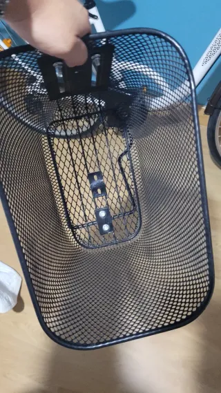 Cesta de malla metálica negra para bicicleta. - Material: Metal. - Color: Negro. - Diseño: Malla. - Montaje: Incluye soportes y tornillos.
