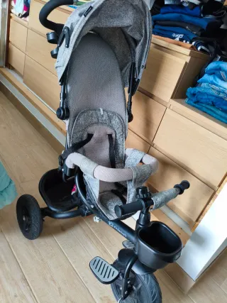 Triciclo con un diseño moderno y funcional, ideal para paseos. - Estructura de color gris jaspeado. - Ruedas negras. - Asa de empuje. - Cesta de almacenamiento. Con dos taras, lo demás perfecto estado Las dos taras lo están en foto 3 y4