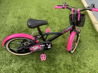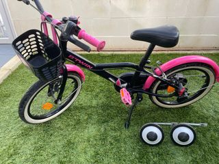 Bicicleta infantil Btwin en color rosa y negro, ideal para los más pequeños. Cuenta con una cesta delantera para llevar sus cosas y ruedines para facilitar el aprendizaje. - Cesta delantera. - Ruedines incluidos.