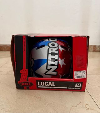 Casco de la serie Nitro Circus, marca Bell, modelo Local, con diseño llamativo y colores vibrantes. Aún conserva sus etiquetas originales. NUNCA USADO - Diseño: Nitro Circus - Talla: M - Color: Plateado, azul y rojo con estrellas blancas - Cierre ajustable
