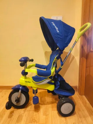 Triciclo evolutivo con muy poco uso,se puede usar desde los 10 meses ya que lleva arneses hasta los 3 años quitando todas sus piezas. Con muy poco uso.