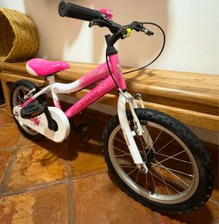 Bicicleta infantil de 16 pulgadas en colores rosa y blanco. - En muy buen estado - Cadena protegida.