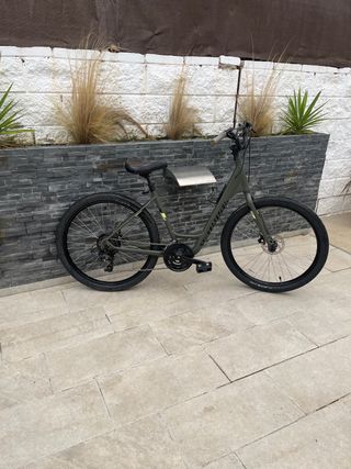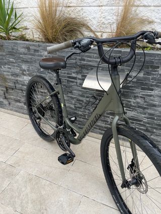 Bicicleta Specialized de estilo urbano, ideal para desplazamientos diarios. - Cuadro de color verde militar. - Ruedas de 27.5 pulgadas. - Sillín marrón. - Frenos de disco.