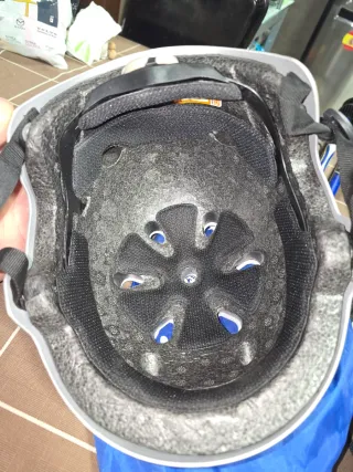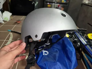 Casco de seguridad plateado, ideal para esquí o patinaje. - Diseño moderno y protector. - Correa ajustable por correa/click y dispositivo de rueda en la nuca para ajustar confortablemente. - Ventilación para mayor comodidad. -Talla M 55-59cm