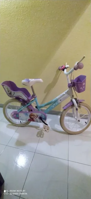 Bicicleta infantil con temática de Frozen, ideal para las pequeñas de la casa. - Color blanco, azul y morado. - Cesta delantera decorada con copos de nieve. - Asiento trasero para muñecas.