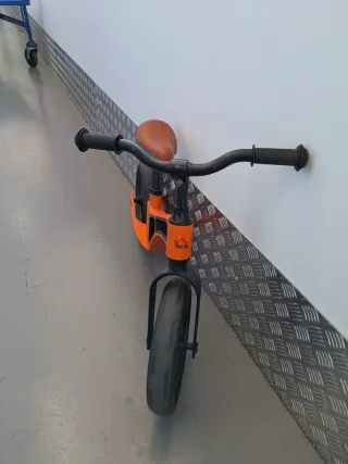 Bicicleta de aprendizaje sin pedales, ideal para los más pequeños. - Marco de color naranja. - Ruedas negras. - Sillín marrón.