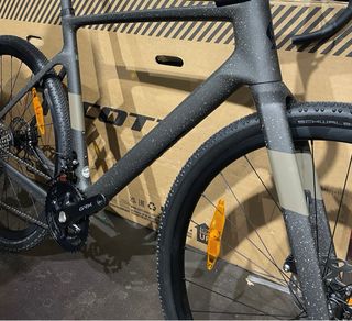 Rebajas en Bike Esplugues: compra tu nueva bicicleta y recibe un casco y unos guantes de regalo valorados en 100 €. Bicicleta Scott Addict Gravel 40 del año 2024. Diseñada para gravel, combina rendimiento y versatilidad. - Cuadro de carbono. - Transmisión Shimano GRX. - Frenos de disco hidráulicos. - Ruedas de 700c con neumáticos para gravel. Color negro mate con topitos Disponible 1 unidad en talla 52 (S) Precio no negociable.