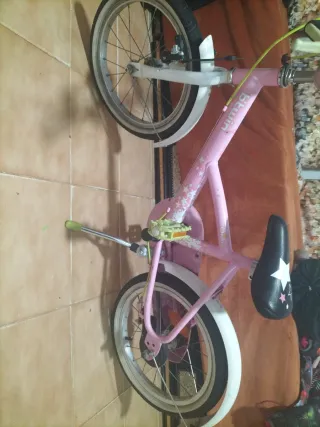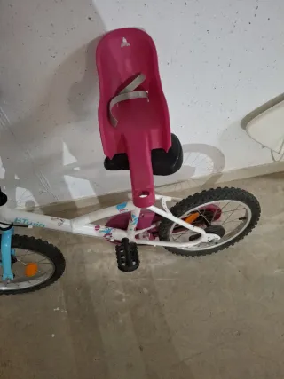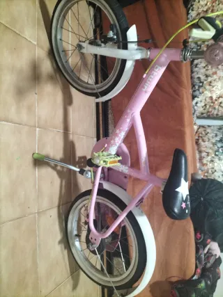 Bicicleta infantil Btwin en color blanco y rosa, con detalles de personajes. - Ruedas de 16 pulgadas. - Guardabarros delantero y trasero. - Sillín negro. - Pedales rojos Tiene 5 usos , mi hija creció y ya no le va