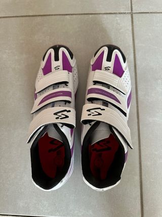 Zapatillas de ciclismo Spiuk Rocca en color blanco y morado. Usadas un mes. Equivalente a un 39 de zapato normal. - Cierre con velcro. - Diseño deportivo. - Suela con ventilación. - Calas insertadas