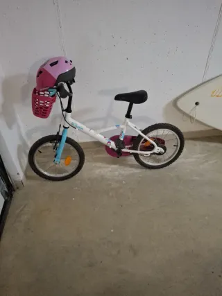 Bicicleta infantil de 16". Ideal para niños de 4 a 7 años que están aprendiendo a montar en bici. Sin ruedines Poco uso pero ha estado siempre fuera, asi que necesitaría algún ajuste, hace meses no la utiliza Tiene portaequipajes trasero y ruedas anchas que dan buena estabilidad.
