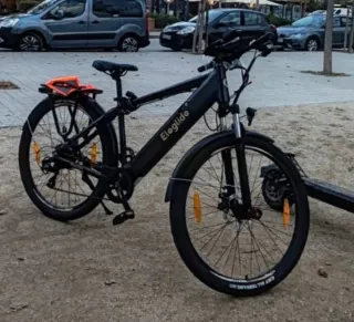 Resumen: se entrega con bolso de reparto, pastillas de frenos, casco, guantes, vaso termino para el agua con funda, base para bebidas, luces led, kit de reparación de neumáticos, cinta protectora, alarma, soportes/bases horizontal para accesorios, entre otros. Detalles: Hay que colocarle un freno y el controlador y pantalla led para el mismo Solo 4 meses de uso pero parada desde Diciembre de 2024. Tengo factura de compra Bicicleta eléctrica Eleglide con ruedas de 27,5 pulgadas. - Cuadro de aluminio. - Frenos de disco. - Suspensión delantera. Velocidad máxima de pedaleo asistido: 25 km/h Motor: 250 W, 50 N.M (par de salida máx