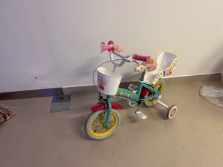 Bicicleta infantil con diseño de Peppa Pig, ideal para los más pequeños. - Color principal: azul verdoso. - Ruedines de apoyo. - Cesta delantera. - Asiento trasero.