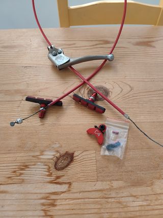 Juego de frenos V-Brake para bicicleta BMX, color rojo. Incluye dos zapatas de freno, dos palancas de freno y juego de cables. Las piezas están en buen estado, con algunos signos normales de uso. Estaba montado en una bh california - Frenos V-Brake rojos. - Una palancas de freno. - Dos zapatas de freno. - Juego de cables.