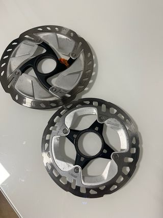 Disco de freno para bicicleta Shimano RT10, 160mm + 180mm para center lock,incluyo adaptador para el disco de 180mm,están sin estrenar quitados de una bici nueva que se ha mejorado.