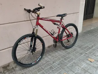 Bicicleta de montaña de color rojo, ideal para terrenos difíciles. - Cuadro de aluminio. - Suspensión delantera y trasera. - Frenos de disco.la entrego engrasada y limpia tiene polvo de estar guardada, esta nueva la e gastado dos veces no a hecho ni Descenso ni nada.fue un capricho.cambiaria por moto que me interesará como honda ns1 80,cross de dos tipos,alguna scoter 125cc 2t.se escuchan ofertas