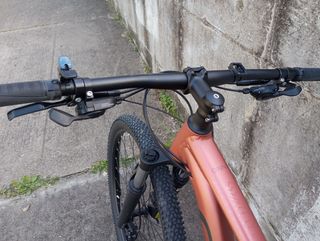 Bicicleta de montaña B'TWIN para adulto en color naranja. Ideal para iniciarse en el ciclismo. Muy poco uso, se vende por no utilizar. - Cuadro de aluminio. - Frenos de disco. - Suspensión delantera. - Cambio Shimano. - Ruedas 26”