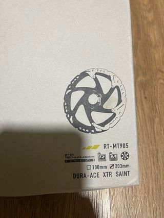 Disco de freno Shimano RT-MT905. - 203 mm - Modelo RT-MT905. - Tecnología ICE TECHNOLOGIES FREEZA. - Compatible con Dura-Ace, XTR, Saint. - Incluye 6 tornillos.