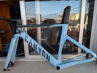 Cuadro precioso del modelo Canyon Aeroad (tercera generación) para frenos de disco. TALLA S (168-178CM) Con FACTURA de compra y todo en regla. Posibilidad de comprar también con las manetas ULTEGRA DI2 y pinzas Ultegra que se ven instaladas en la imagen.