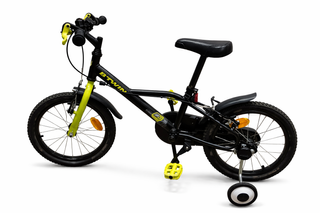 Bicicleta infantil B'TWIN en color negro y amarillo, ideal para niños de 4 a 7 años. Incluye ruedines (sencillos de extraer y colocar,) para facilitar el aprendizaje. - Cuadro de acero resistente. - Ruedas de 16 pulgadas. - Frenos de tambor. - Sillín ajustable en altura. - Pedales antideslizantes.
