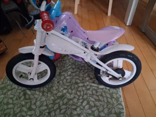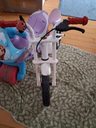 Bici de aprendizaje sin pedales para niños pequeños, ideal para iniciarse en el mundo de las dos ruedas. Su diseño ligero facilita el manejo y el equilibrio. Tiene freno de tambor trasero y el sillín es ajustable. Está usada pero cumple perfectamente su función. De 2 a 4 años - Marco blanco resistente. - Ruedas negras. - Asiento morado y rosa. - Puños rojos.