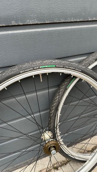 Pareja de ruedas para freno de varilla. Medida 28” 622-22 Marca Ambrosio Estado nuevo, con pequeñísimos toques en el aro porque llevan tiempo almacenadas. Se entregan con cubiertas Schwalbe Road Cruiser y piñón libre de 18 dientes. Preferiblemente entrega en mano por el peso.