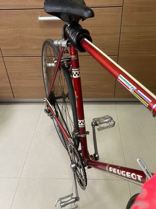 Bicicleta clásica Peugeot en buen estado. - Año 1975-1976 - Cuadro de acero. - Ruedas de 700c. - Frenos de varilla. - Manillar de carretera. Medidas cuadro: -De eje a eje 105cm -Tubo vertical 54cm Con las ruedas el sillín bajo queda en 91cm