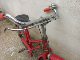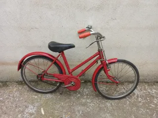 Bicicleta clásica de color rojo, ideal para niños y niñas de corta edad, emblemática pieza antigua muy bien conservada. También para exposición y decoración. Se alquila para rodajes de pelis antiguas. Cuadro tamaño especial y único con frenos de varillas. Ruedas de 20 pulgadas. Timbre en el manillar.