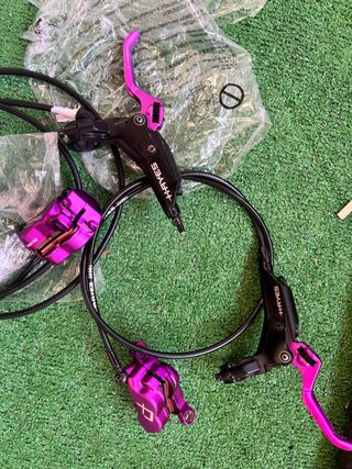 Set de frenos de disco hidráulicos Hayes A4 en color morado. Por cambio de sponsor los vendo Con pastillas muevas galfer estan como nuevos - Manetas de freno de aluminio. - Pinzas de freno de disco. - Latiguillos de freno. Bizum / paypal o en mano Envios 24h