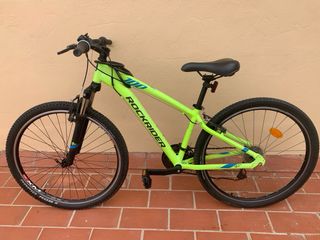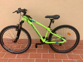 Bicicleta de montaña Rockrider 100, ideal para iniciarse en el ciclismo. - Color verde lima llamativo. - Ruedas de 24 pulgadas. - Frenos V-Brake. Necesita arreglar frenos. La cadena está oxidada. Cámaras de aire es posible que haya que cambiarlas.