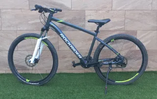 Bicicleta de montaña Rockrider ST520 con ruedas de 27.5 pulgadas. Cuadro de aluminio. Talla L (de 1,75 a 1,85 m, según fabricante) Frenos de disco mecánicos Hayes MX5 con pastillas nuevas. Palancas de freno Tektro de 2 dedos. Suspensión delantera de 80 mm ajustable según peso del ciclista. Triple plato con cassette de 8 velocidades. Desviador Shimano Altus y cambio trasero Sram X3. Pedales de série Btwin. Sillín sport Ergofitsystem. Ideal para uso diario, camping, pistas, vias verdes y caminos. Con marcas de uso, pero no tiene arañazos grandes, abolladuras, golpes, ni nada roto. Bién conservada y mantenida. Incluye el caballete.