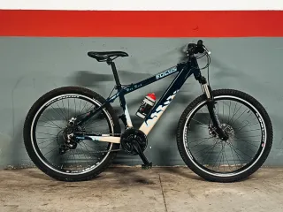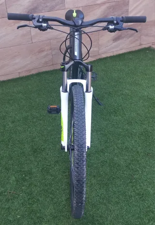 Bicicleta de montaña Rockrider 740S en color blanco y azul. Ideal para senderos y terrenos irregulares. - Cuadro de aluminio. - Frenos de disco Hayes prime - Ruedas de 27.5 pulgadas. - Cambio Sramx9 - Suspensión doble Ruedas mavic crossride 27,5 precio nuevo con extras mas de 2000 €. Cassete y cadena 100km