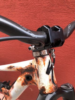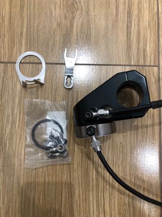 Rotor para freno hidráulico marca KHE Affix 360 Va integrado en la potencia. Asi no da tanta altura como otros rotores. Potencia de 50mm de largo para manillares de 31,8 Va con los latiguillos ya montados, para conectar maneta y pinza directamente. Van con otro kit de banjos, conectores, torica de repuesto y dos bloqueadores inferior, uno que va anclado a la potencia y otro va al cuadro. Se monto y no se llego a usar. Pone que es para liquido DOT pero en la web pone que tambien funciona con aceite mineral freno dirt slope disco xt saint deore xtr level sram code guide maven avid magura formula shimano brake rotor giro gyro oryg