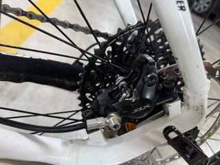 La bici es una Mérida Ninety-Six 9600 en talla M, transmisión completa en Shimano SLX 2x11 y frenos Shimano SLX, suspensión delantera Manitou Marvel y suspensión trasera Rock Shok Monarch, lleva pedales de plataforma, portabidones, cuentakilómetros y ruedas tubelizadas con líquido recién echado, es fácil pasarla a monoplato ya que inicialmente lo era