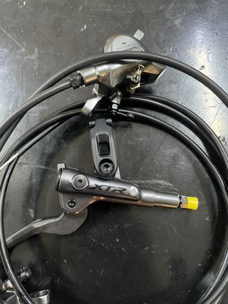 Conjunto de frenos hidráulicos Shimano XTR M9100. - Maneta de freno de carbono. - Cuerpo de freno de aleación. - Cable de freno negro. - Nuevos a estrenar desmontados de una Orbea Oiz